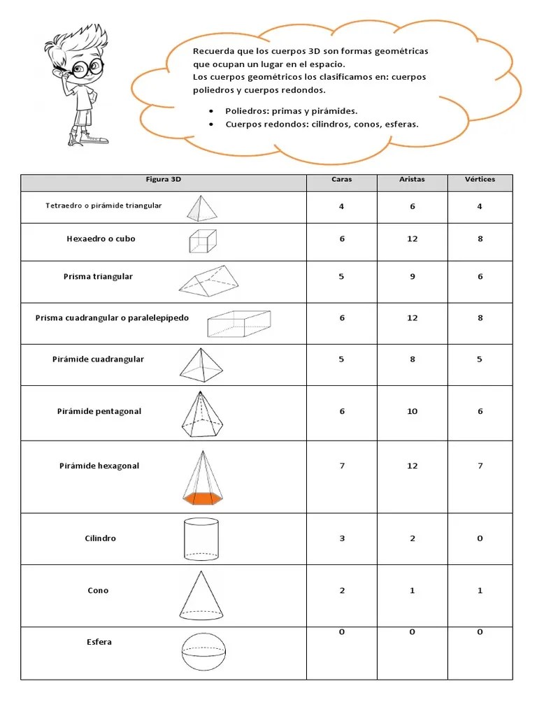 Es decir, la principal diferencia entre un polígono y un poliedro es que el primero es una figura bidimensional, mientras que el segundo posee tres dimensiones, lo que permite calcular su volumen, yleer más B ¿cuál es la relación llamada fórmula de euler que hay entre el número de caras, de vértices y de aristas en un poliedro simple? Su cara tiene la forma de un círculo y, debido a que es redondo alrededor del exterior, no forma bordes ni vértices. Aplica pegamento a las pestañas dibujadas con líneas discontinuas. Son cuerpos geométricos cuyas caras son todas polígonos (pueden ser triángulos, cuadrados, pentágonos, hexágonos…).